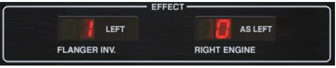 The flanger feedback can be inverted on the left or right channel, both or neither. Flanger Invert only affects the TC1210 when Flanger or X Flanger effects are selected in either of the engines. This inverts the feedback in the Flanger effect, putting a gentle spectral notch at DC in the feedback, resulting in a slightly brighter quality to the ringing part of the effect. It affects the sound primarily at short delay settings where the comb filter notches are fairly spread in the frequency spectrum.