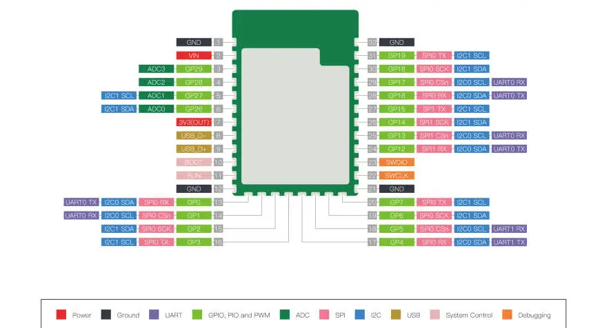 We take the pins of the RP2040 chip out, including GPIO/I2C/SPI/UARTs. In addition, this module has an onboard PCB Antenna, no need to design the antenna separately, so you can quickly deploy the module to your own board. 一, Key Features