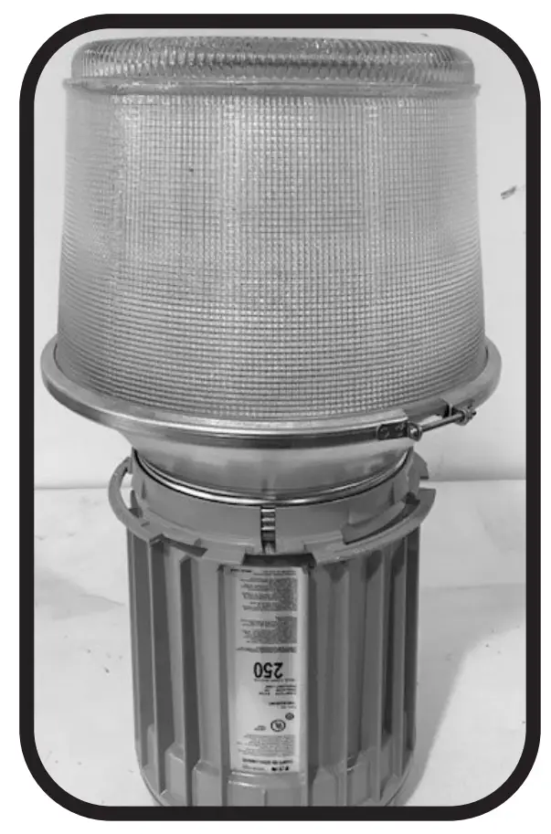 CAUTION: To reduce risk of ignition of hazardous atmospheres, disconnect the luminaire from the supply circuit before opening. Keep tightly closed when in operation. This Modified Luminaire is suitable for use in: Class I, Division 2, Groups A, B, C, D; Class 11, Division 1, Groups E, F, G; Class 11, Division 2, Groups F, G. Temperature Code T4. 120-277VAC, 60 Hz, 1.26A Maximum, 115 or 150W Nominal. Maximum Modified Luminaire Ambient Temperature 4o·c. This Luminaire has been modified to operate LED lamps.