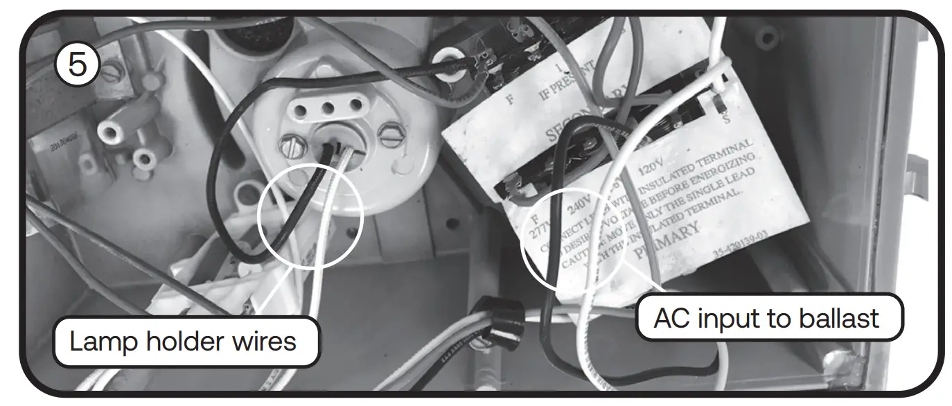 - Cut the white (neutral) and color (hot) wires from the lamp holder in the center of the ballast housing, leaving as much wire attached to the lamp holder as possible.