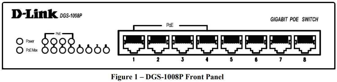 In this guide, the term “Switch” (first letter capitalized) refers to the DGS-1008P, and “switch” (first letter lower case) refers to other Ethernet switches. Some technologies refer to terms “switch”, “bridge” and “switching hubs” interchangeably, and both are commonly accepted for Ethernet switches.