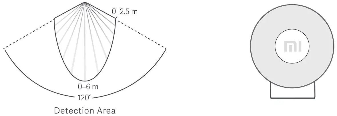 The det ection area is a 120° area directly at the center in front of the night light. The detection area covers 0-6 min front of the light, and 0-2.5 m to the sides. The detection effect depends on the angle of the light, ambient temperature, body size, and moving speed. The illustrated detection area is based on the direction the logo is facing.