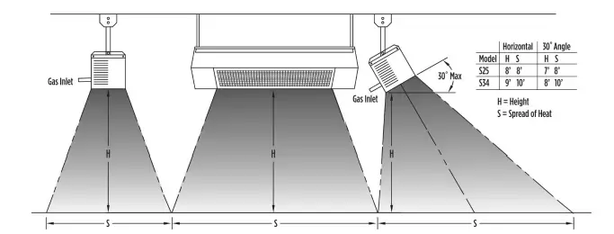 Heater placement is critical for effective and efficient patio heating. If heaters are placed too close together or mounted too low, people become uncomfortable. If heaters are placed too far apart on a breezy, wind-swept patio the patio may never get warm. Sunpak® heaters work best if they are placed in areas of the greatest heat loss, such as the open side of a semi-protected patio area. The Sunpak® heater may be mounted at up to a 30-degree angle or face down. Note that the top clearances required from combustible material increase when heaters are at an angle. The heater must always be horizontal to the floor. Never mount the heater in the vertical position.