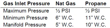 The gas inlet supply pressure and manifold pressures required for each heater are listed below. For gas supply line pressures in excess of ½ PSI, consult with your gas service provider or the factory.