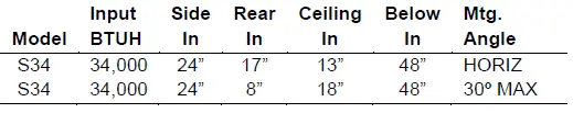 The stated clearance to combustible materials represents a surface temperature of 90ºF (32ºC) above room temperature. Building materials with a low heat tolerance (such as plastic, vinyl siding, canvas, tri-ply, etc.) may be subject to degradation at lower temperatures. It is the installer’s responsibility to assure that adjacent materials are not subject to degradation. In locations used for storage of combustible materials, signs shall be posted to specify the maximum permissible stacking height to maintain required clearances from the heater to combustible materials.