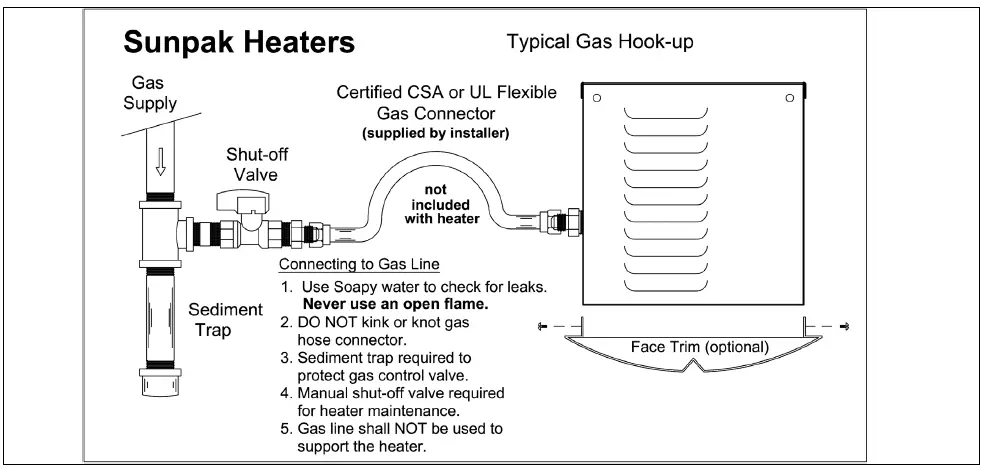- Installation of a drip leg or sediment trap in the gas supply line going to each heater is required to minimize the possibility of any loose scale or dirt within the gas supply line entering the heater’s control system.