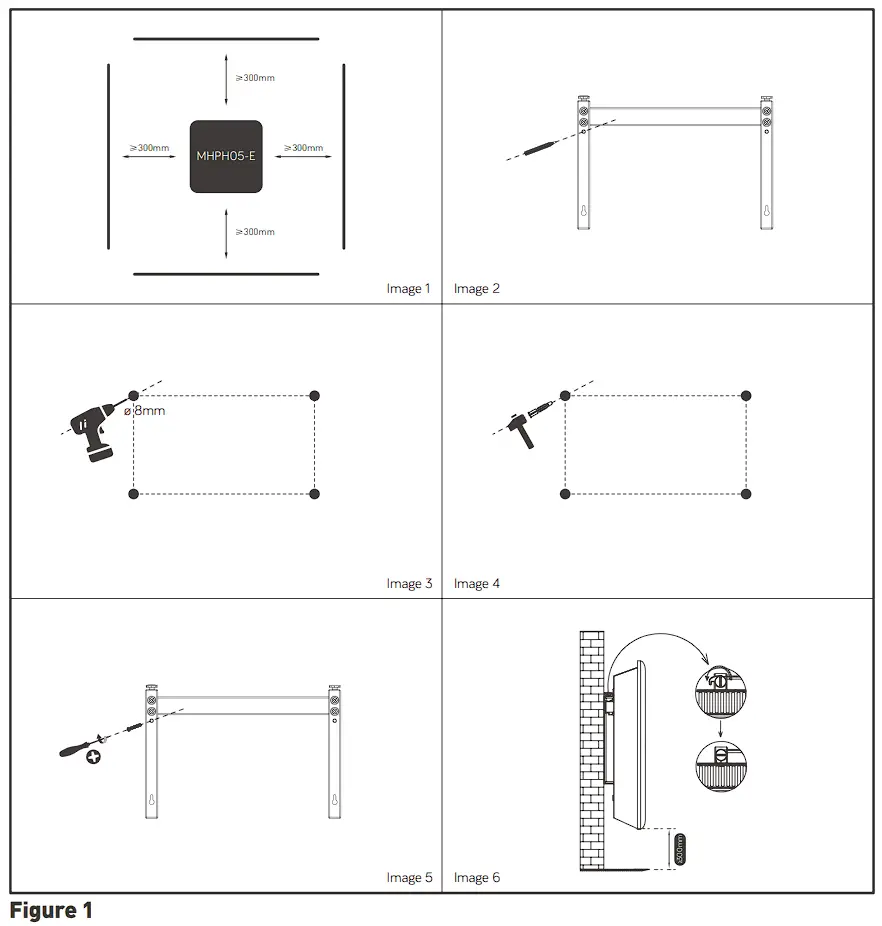 Warning: Be sure to keep a distance around the heater of at least 30cm (300mm) see image above.