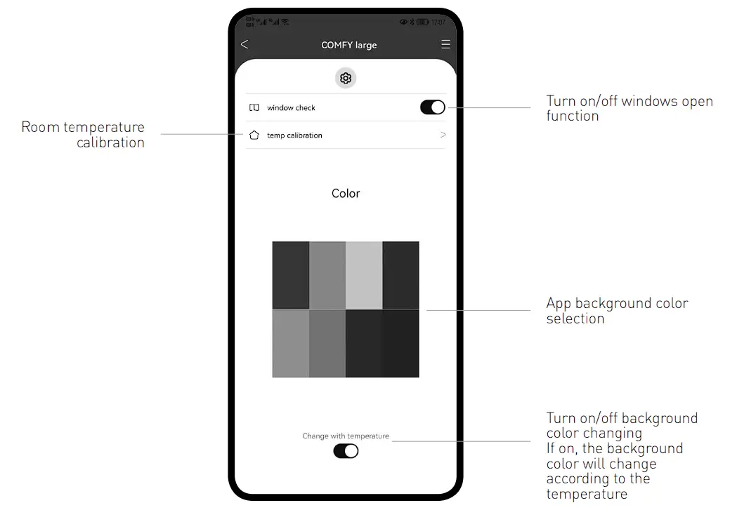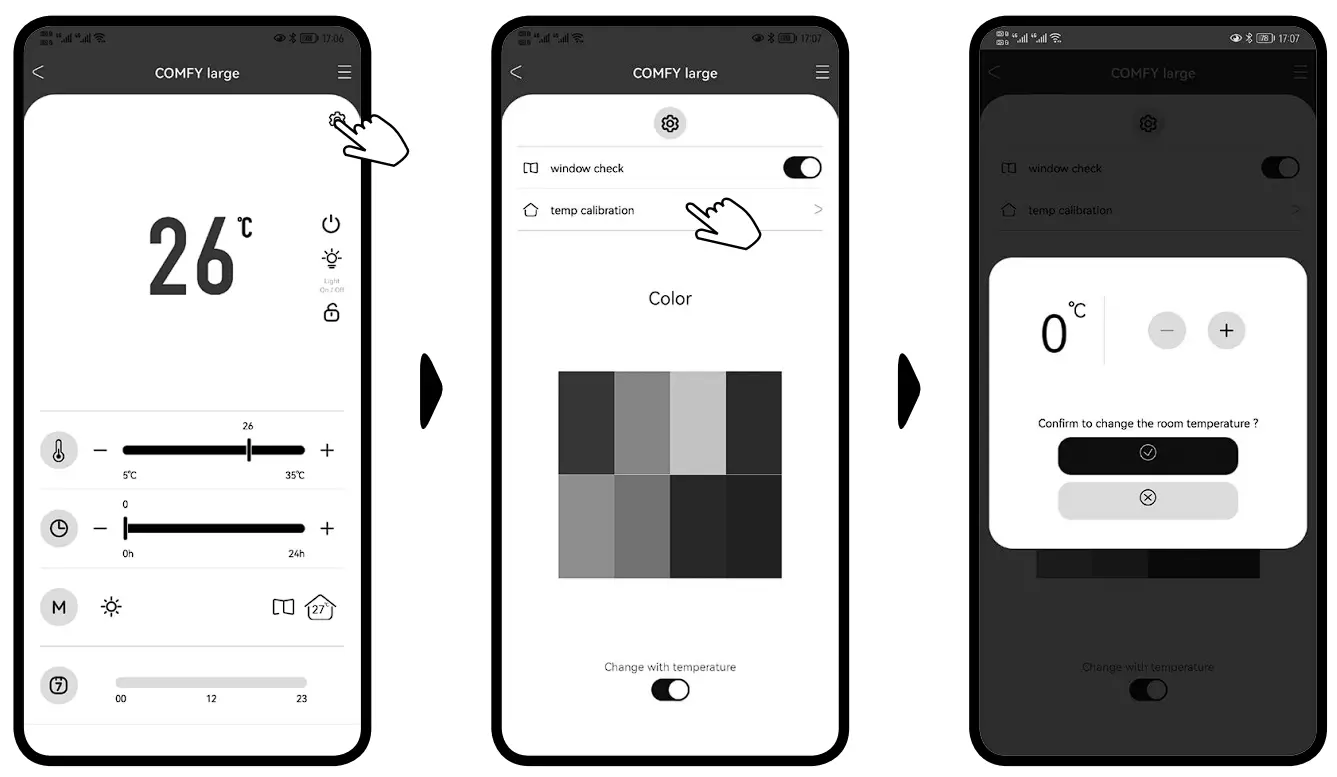 Use this function to set the Room Temperature Calibration to the correct room temperature if it is reading incorrect. Select temp calibration and then adjust temperature to current room temperature and select the tick box. The current room temperature is now set.