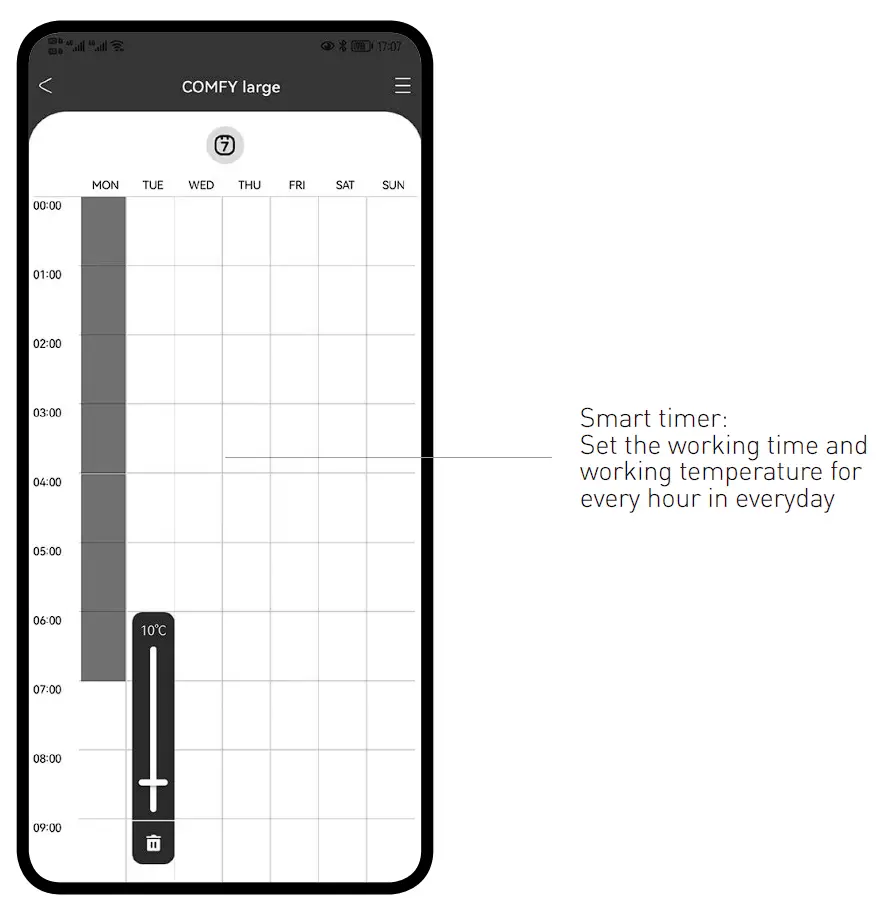 ”. In this mode you cannot set the countdown timer or adjust the temperature or set the window open function. The target temperature is 7ºC, if the room falls to 7ºC or below, the unit will operate. This is a preferred mode for garages, caravans etc.