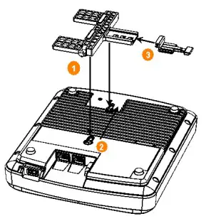 - Slide the T-bar bracket away from the Ethernet ports on the bottom of the AP until the AP retainer tab snaps into place, trapping the T-bar bracket studs in the keyholes (2 in Figure 3).