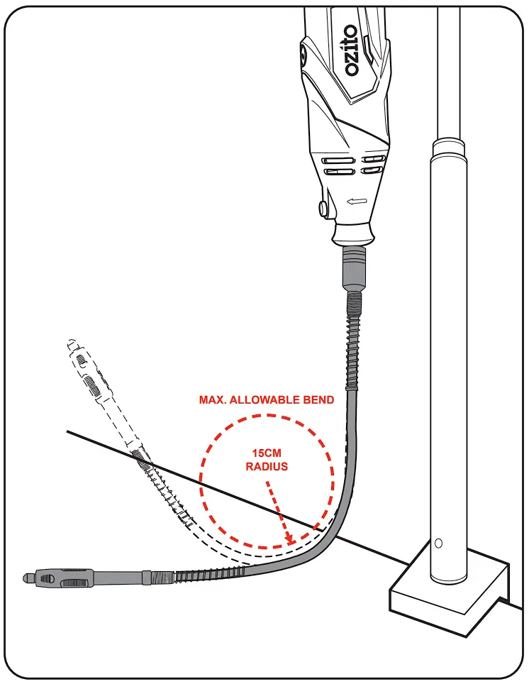 - Do not operate the flexible shaft with a sharp or multiple bends. Ensure that there are no sharp residual bends or kinks in the flexible shaft before operation. Over bending the shaft can generate excessive heat on the jacket or hand piece and may cause the flexible shaft to disengage from tool. The minimum recommended bend radius is 15cm.