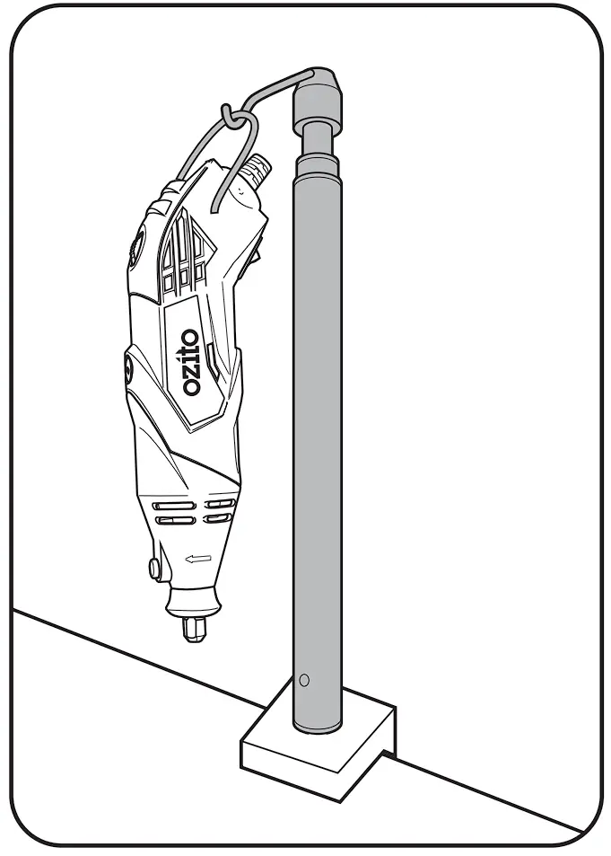 - Ensure that the desk stand is secure and then hang the rotary tool onto the hook by the hanging ring.