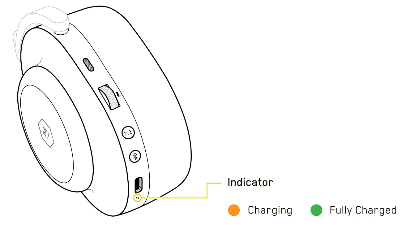 A solid orange light indicates charging and a solid green light indicates a full charge when the USB cable is connected.