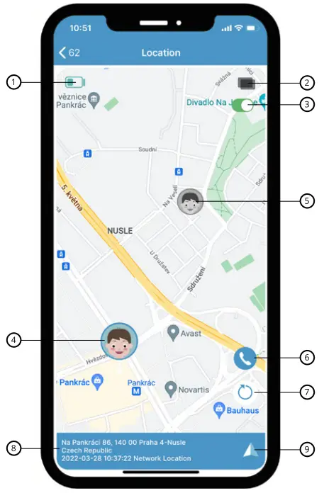 Safe zone – allows setting a safe zone (position, distance) such as home, school etc. If the watch leaves the safe zone, the user of the application is notified. The same notification also arrives when the watch returns to the safe zone.