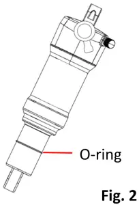 - Position your bicycle next to a wall so that you can sit on the bike with both feet on the pedals while steadying yourself with one arm. Gently sit on the saddle without bouncing. Dismount gently without bouncing and take note of how far the O-ring has moved down the shaft. Measure distance O-ring has moved (Fig. 2).