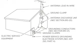 grounding of the lead in wire to an antenna-discharge unit, size of grounding conductors, location of antenna discharge unit, connection to grounding electrodes, and requirements for the grounding electrode. See following example: