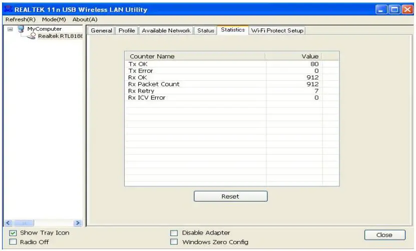 To view the statistical data of wireless network card, click `Statistics‘ menu, and the statistics of wireless connection will be displayed: