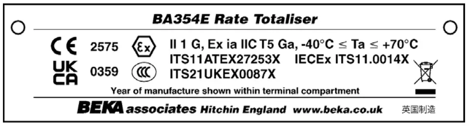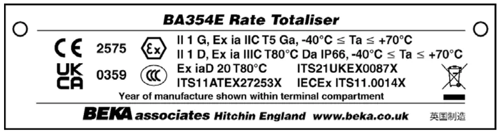 The BA354E has IECEx, ATEX and UKEX intrinsic safety certification for use in flammable gas atmospheres. The certification label, which is located on the top of the instrument enclosure shows the certificate numbers and the certification codes. Copies of certificates may be downloaded from our website.