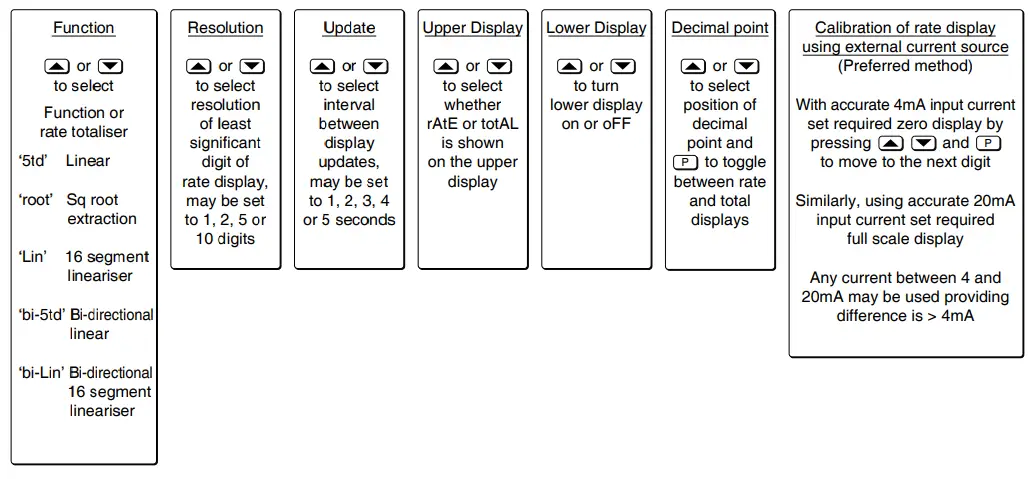 Access to the configuration menu is obtained by pressing the P and E buttons simultaneously. If the totaliser security code is set to the default ‘0000’ the first parameter ‘FunC’ will be displayed. If the totaliser is protected by a security code, ‘CodE’ will be displayed and the code must be entered to obtain access to the menu.