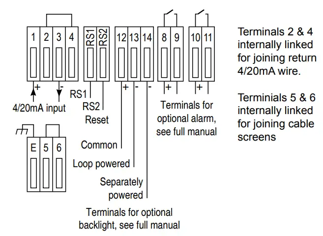 Terminals 8, 9, 10 & 11 are only fittted when the rate totaliser includes optional alarms. See full manual for details.