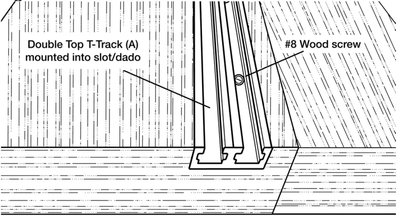 Using 9 #8 flat head wood screws (not included) fasten Double Top T-Track (A) into slot/dado (use epoxy for increased holding power, optional). Cut track to desired length, if needed.