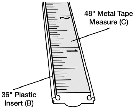Cut Metal Measuring Tape (C) to fit Plastic Insert (B). Remove the protective backing from the metal tape measure and carefully place it onto the flat side of the 36″plastic insert.
