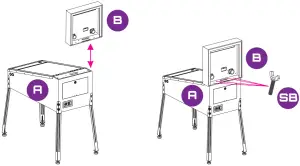 Step 1. Take out the playfield, legs, and 8 [SA] screws. Put the playfield upside down on a soft surface. Attach the legs to the main cabinet and insert 8 [SA] screws to the matching holes with [a] hex key.
