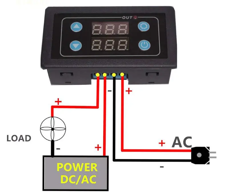 Timer Easy Setting Instructions The upper display is referred to as (T1 or PV) and the lower display is referred to as (T2 or SV). The LED labeled “out” indicates that the relay contacts are closed when it lights up. Time set mode: Short Press the SET button and use the up and down buttons to set the time in the Top display(T1 or PV) short press the set button to set the time displayed in the bottom display (T2 or SV) short press the set button again to save and run. Time unit setting Mode. You can set the timer to work in seconds, minutes or hours: Long press the SET button for 6 seconds or until P0 is displayed in the top display. Press the up-down buttons to set the time unit mode in the bottom display (T2 or SV) Top display=P0 bottom display=0 – seconds Top display=P0 bottom display=1 – minutes Top display=P0 bottom display=2 – hours There are 5 timer sequence modes: Long press again to set the operating mode when P0 is displayed press set to display P1 then press the up-down buttons to display 1 or 2 or 3 or 4 or 5 to set the type of timed operation you want. P1-0 Load is off until (T1 or PV) time counts down to 0 then the load will come on and stay on. P1-1 The load comes on as the power button is pressed. After PV Time the load will go off. P1-2 The load is off for (T1 or PV)(delay time) then the load switches on and runs for the time set in (T2 or SV) then switches off until the power switch is pressed to cycle again. P1-3 Load is on until PV Time runs out Then after SV time runs out the load will come on and stay on. P1-4 Load is off until (T1 or PV)(Delay) time counts down to 0, then load comes on until SV time counts down to 0 then the load is off then it cycles again and again-auto cycle. P1-5 The load is on until (T1 or PV) time counts down to 0 then powers down and after (T2 or SV)Time counts down to 0 the load will start working and cycle again and again-auto cycle.