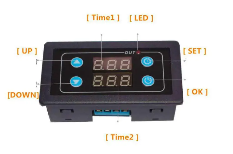 (1) After Short-press the SET button, the T1 digital tube will flash. During this period, you can set time via the UP, DOWN button. After you finish the above steps, please short press the SET button again. The T2 digital tube will flash, you can set the time via the UP, DOWN button. There are 2 ways to save data, for example, you can wait 6 seconds until the digital tube stop flashing, the system will save data automatically; you can also short press the SET Button again to save data.