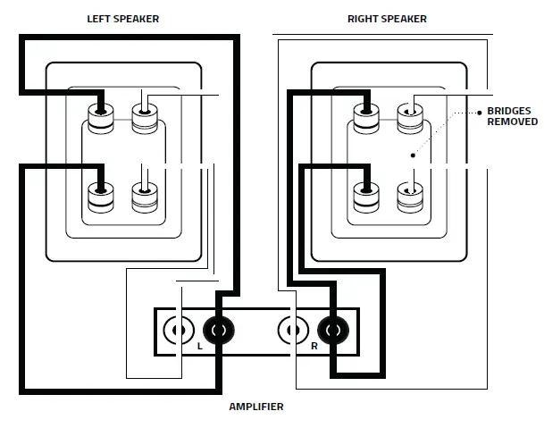 Some of our models have speaker wire connections to allow for bi-amping or bi-wiring. This is for your benefit and can be used to enhance the performance of your system. Connection of a basic audio system, where there is only one connection from the amplifier, is very simple and bi-amp or bi-wire is not necessary. You can connect your speakers using the regular left and right speaker wire connections and ignore the second set of terminals. There are gold-plated bridges connecting the two sets of terminals that allow the speaker to be connected as a traditional loudspeaker. Only remove these bridges if you plan to bi-wire or bi-amp your speakers. See the Bi-Amp Connection and Bi-Wire Connection sections of this manual for more information.