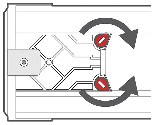 ![]() | At the end of the rail opposite to the lever there is an adjustment block that allows you to fine-tune the fitting of the rail. Use a flat-head screwdriver to twist the small red plugs in toward the centre of the rail. Slide the block out of the rail by a few millimetres, then twist the red plugs back into their original position to fix the block in place. Make small adjustments only, repeating as necessary for a tight fit. |