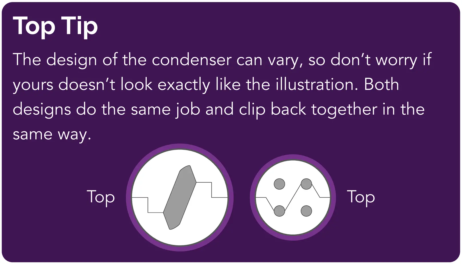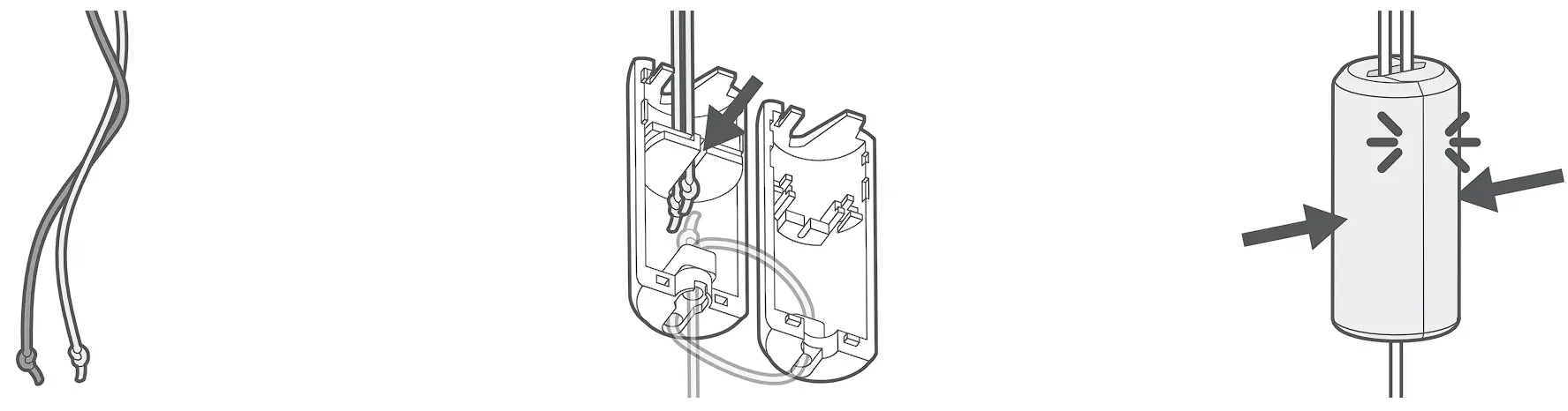 - Slot the cords into the channel in the centre of one half of the consenser. If your condenser differs slightly from the diagram, don’t worry, just slot any cords that aren’t already tied into place inside in the same way.