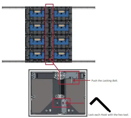 - Push each Locking Bolt and lock each Hook with the hex tool to securely connect each cabinet together. It may be necessory to align the hole with an Allen wrench in order to engage the Locking Bolt