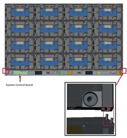 NOTE: Use caution as the System Control Box panel is separated into two pieces with wires attached. - Align the holes of the Cabinet with the System Control Box to attach.