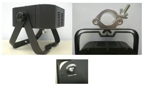 The MICROH LED SLIM P64 provides a unique mounting bracket assembly that integrates 2 brackets to be used to mount on a truss or the floor. When mounting this fixture to truss, be sure to secure an appropriately rated clamp to the included bracket fitted through the center hole. As an added safety measure, be sure to attach at least one properly rated safety cable to the fixture.
