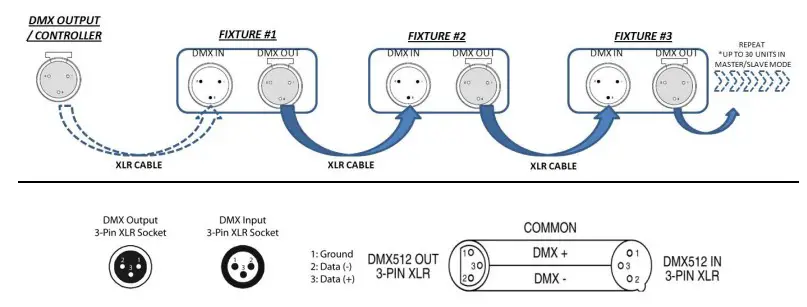 This fixture complies with international USITT DMX standards and can be used with either a 3 pin or 5 pin DMX connector. Plug in the provided 3 pin XLR cable to the female 3-pin XLR output of your controller and the other side to the male 3-pin XLR input of the MICROH LED SLIM P64. To connect the units to DMX, you must daisy chain the fixtures together as referred in the diagram below.