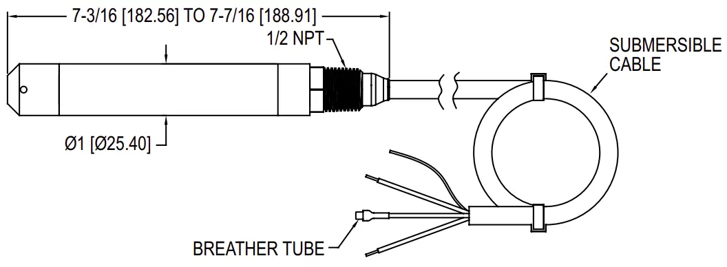- Mounting: The transducer can be mounted via several methods. It can be suspended from the electrical cable, it can be placed resting on the bottom of the tank in either horizontal or vertical orientation, or it can be attached to a pipe or hang wire by the 1/2˝ NPT male connection on the top of the housing.