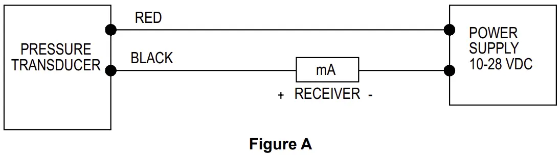 Wire Length: The maximum length of wire connecting the transducer and receiver is a function of wire size and receiver resistance. Wiring should not contribute more than 10% of the receiver resistance to total loop resistance. For extremely long runs (over 1000 feet), choose receivers with higher resistance to minimize the size and cost of connecting leads. Where wiring length is under 100 feet, wire as small as 22 AWG can be used. - Wiring: An external power supply delivering 10-28 VDC with minimum current capability of 40 mA DC (per transducer) is required to power the control loop. See Figure A for connection of the power supply, transducer and receiver. The range of appropriate receiver load resistance (RL) for the DC power supply voltage available is expressed by the formula: