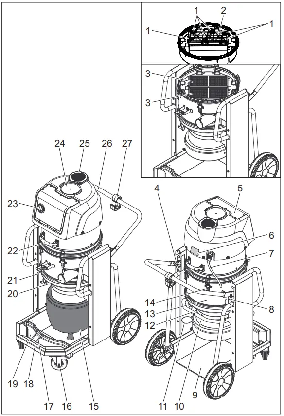 The appliance has an innovative double filter dedusting that is particularly effective with fine dust. The flat folded filters are automatically cleaned every 15 secods through an air jet (pulsating sound).