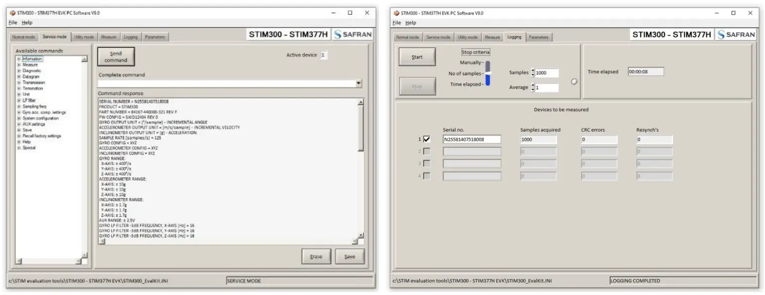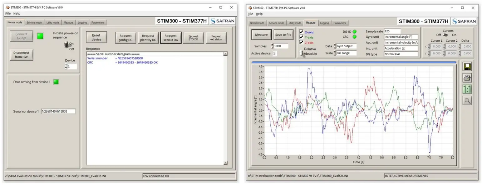 The STIM series evaluation tools offer easy measurement and configuration access for STIM gyro modules and IMUs. The tools support data sampling at alternative rates, graphical data presentation and data log to file for up to two gyro modules/ IMUs in parallel. RS422 interface for PCIe or USB, necessary cabling and PC software are included in the kits.