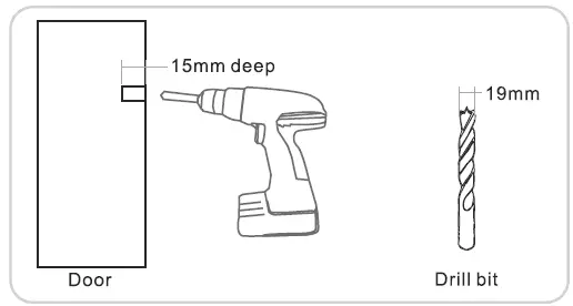 Drill a corresponding hole in your door. The hole should be 15mm deep and 19mm wide. The position of the hole should align exactly counterpart to hole in the door frame.