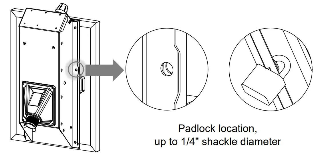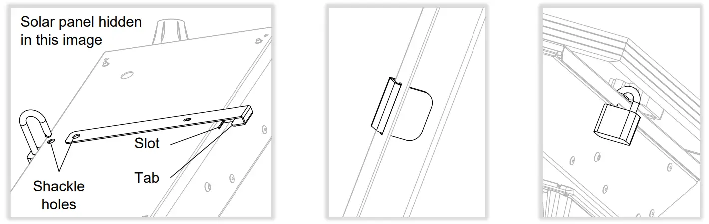 Maximum padlock shackle diameter 1/4″. Some padlocks will require loosening or removal of solar panel when installing.