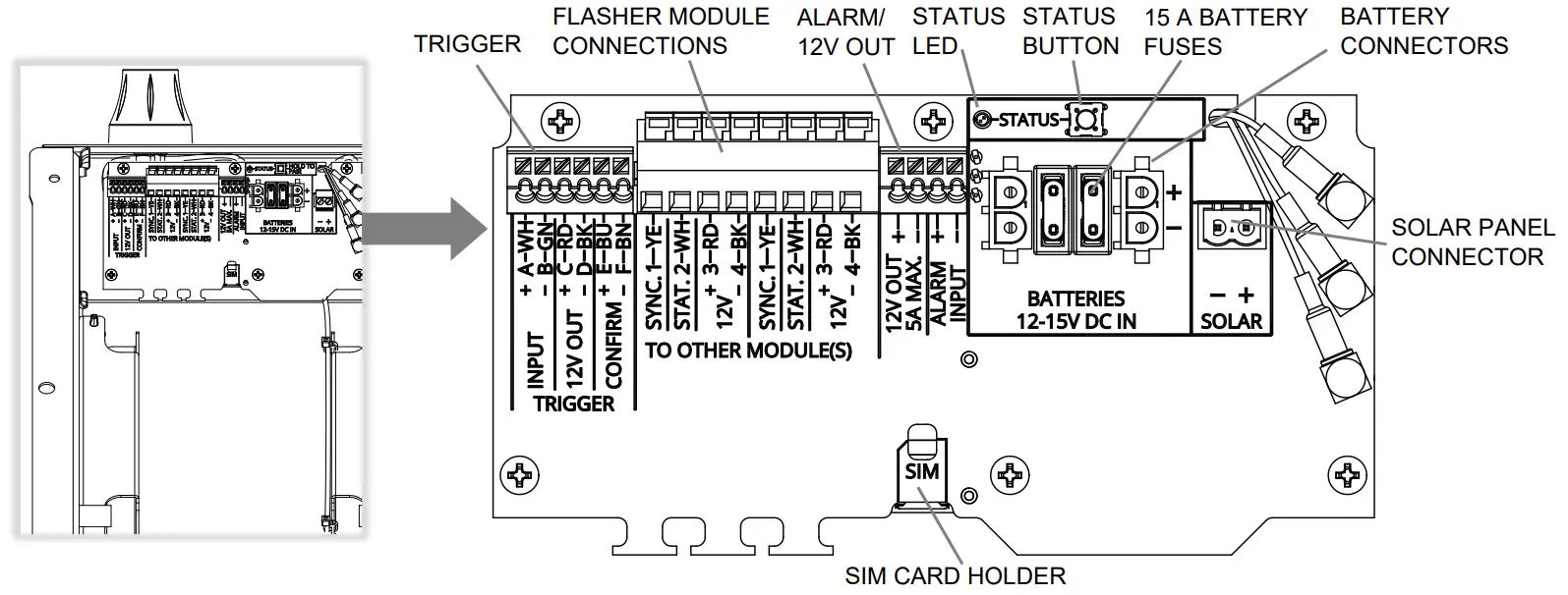 | 12V+ | Provides 12-15 VDC to power connected flasher modules. Can be daisy-chained between flasher modules to simply wiring. | |