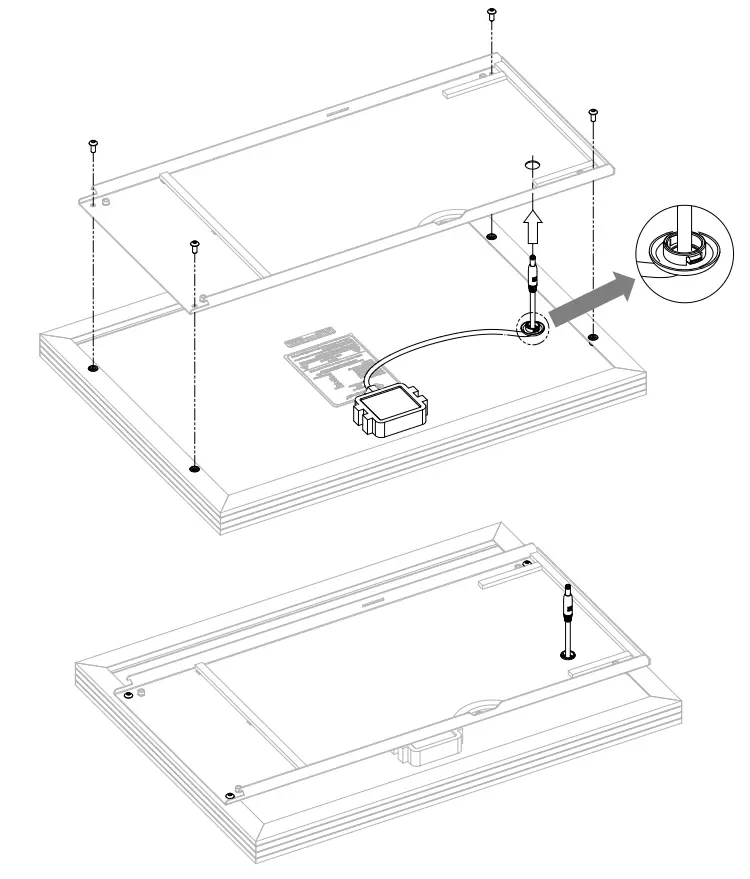 - Align hook features on lid with tabs on chassis. Mate solar harness connectors. Lower panel/lid assembly onto chassis and fasten with four screws.