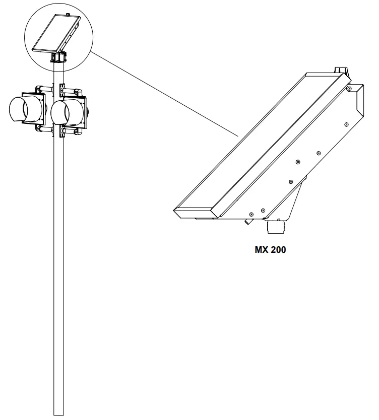 The MX 200 Solar Power Module contains the solar panel, battery(s), solar charge controller, schedule function, day/night determination, radio for wireless synchronization, remote connectivity hardware and system-level settings.