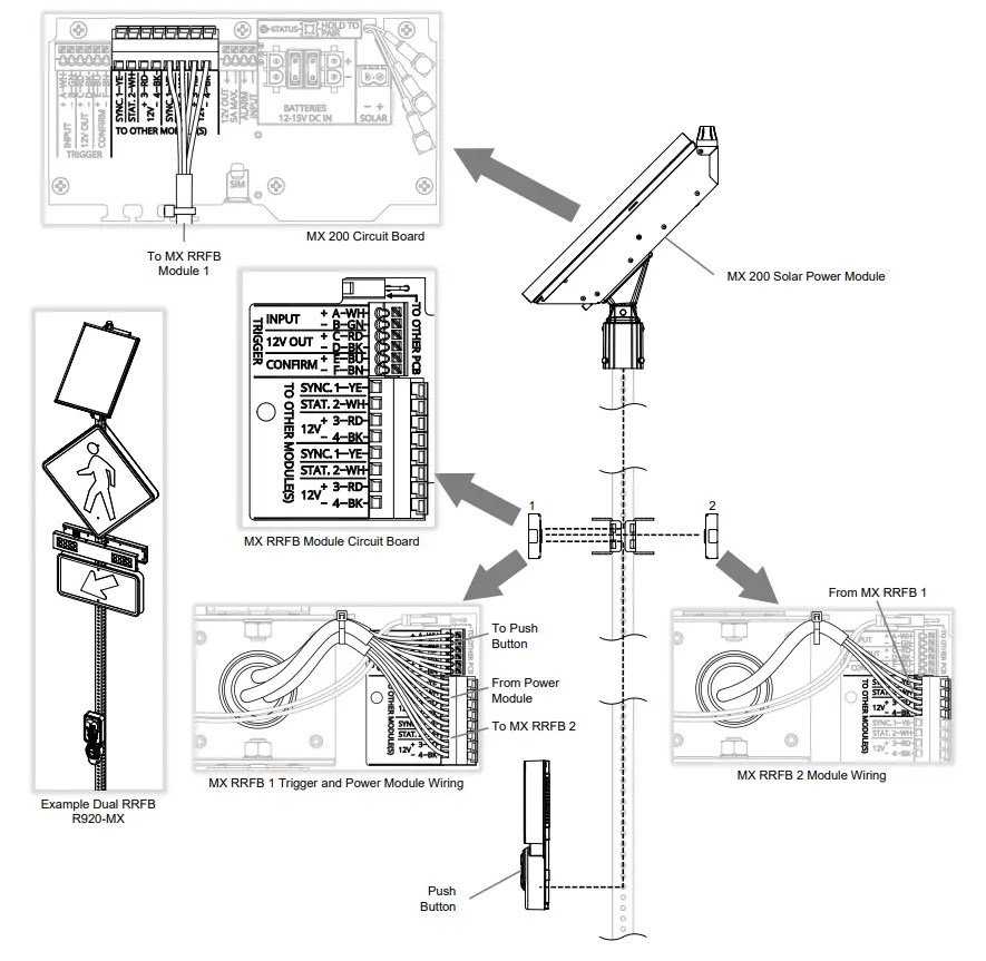 - MX RRFB Module light bar flashing starts with left module first (if applicable), RRFB is in correct orientation and verify the indicator LEDs on ends of light bars are seen by pedestrians across street.