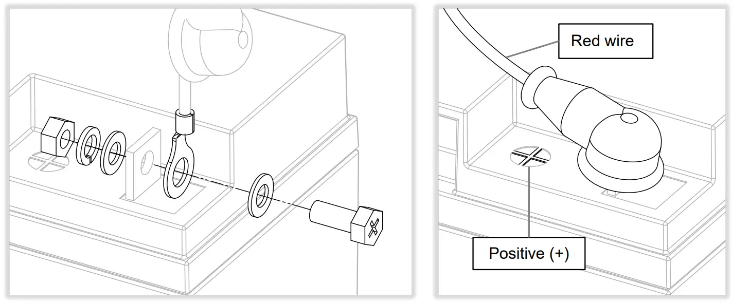 For single-battery systems, use the longer battery harness. - Fasten ring terminals to battery terminals as shown: