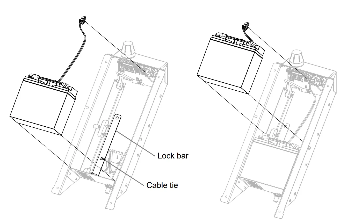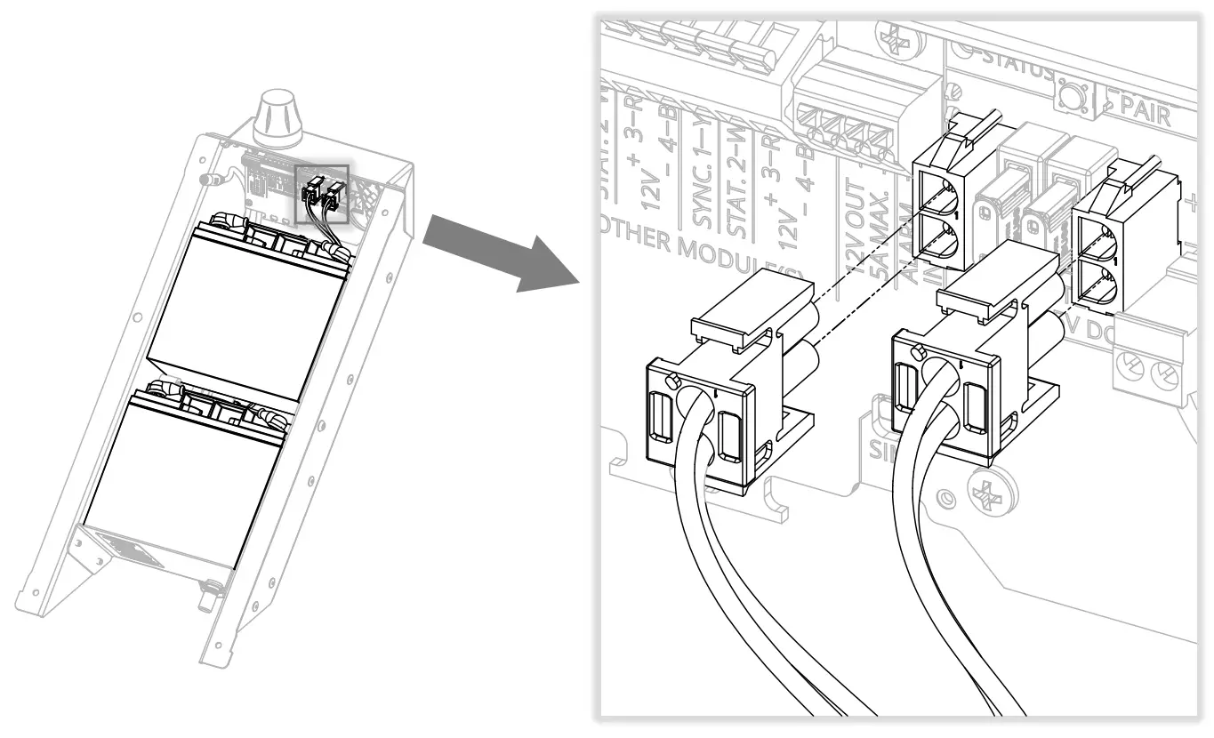 Finish installation of all modules and kits prior to powering up the system. - Install battery with longer harness into lower position in MX 200 housing as shown. Install optional second battery with short harness into upper position.