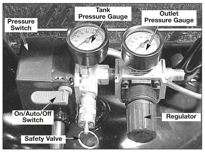 | Excessive tank pressure – safety valve pops off. | The pressure switch does not shut off the motor when the compressor reaches “cut-out” pressure.Pressure switch “cut-out” too high. | Move On/Auto/Off lever to the “OFF” position, if the outfit does not shut off contact a Trained Service Technician. Contact a Trained Service Technician. |