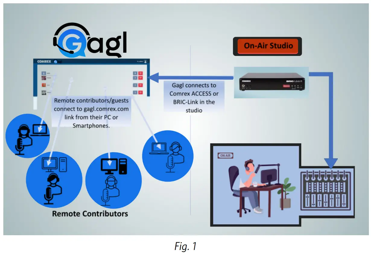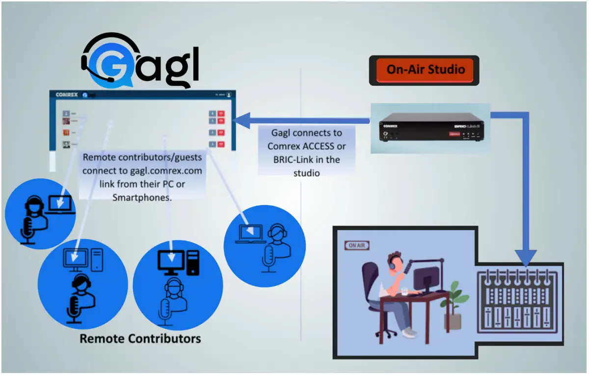 Gagl is a cloud service offered by Comrex. It allows between one and five users to send and receive audio from computers and smartphones. That audio is conferenced (if more than one user), and delivered to a Comrex hardware codec (such as ACCESS or BRICLink, usually in a studio). All participants can hear other participants and the codec “send” audio back to them.